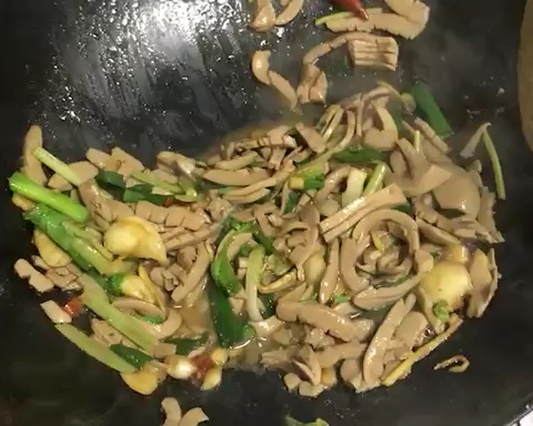 下多点油,爆香,姜丝,蒜头,辣椒,然后火开最大的时候下猪腰,翻炒30秒下葱和芹菜,酱油,爆炒40秒,出锅