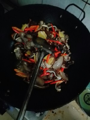 以上食材备好,热油后,倒入切好的猪耳片,翻炒2分钟。再放入红椒和姜片爆炒一下。