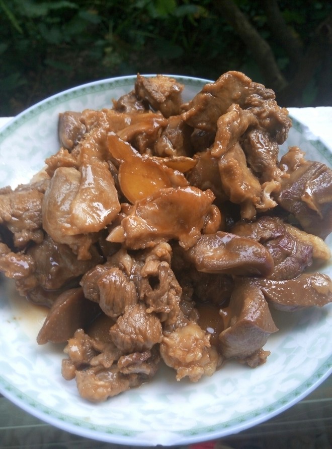加入水,酱油,福建老酒,盐,糖,鸡精,翻炒几下.盖上锅盖煮.(水多放点不然到时候汤汁没了肉还没熟??别问我怎么知道的??)