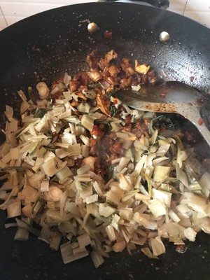 开火,倒入猪肺和猪心,炒到没有汤水,加入菜籽油,继续炒,爱吃辣的放点干辣椒。