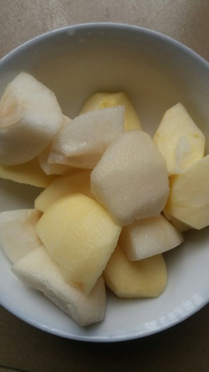 把梨和苹果削皮切块,不用削皮也可以,但要用细盐把梨和苹果的表面搓洗干净。