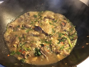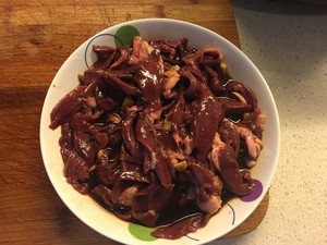 放油烧热加蒜片爆香后放入腌制好的猪心大火一炒,有水出来加酸辣椒焖煮3一5分钟(水快干就差不多了)有香菜叶和蒜苗的话可加入