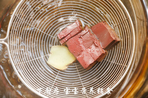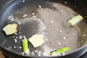 PS:因为正常咱们大人吃的话,会在汤里加上点料酒去腥,但这种方法不太适合给宝宝做辅食用,所以我加了一片姜片来一起焯水,这样也能把猪血的腥味给去除一下。