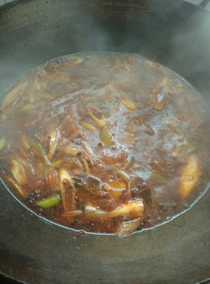 随后加入4汤匙豆瓣酱,八角,香叶,砂仁炒出香味后