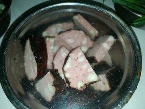 猪血丸子切厚片,泡冷水十分钟。这一步主要减少盐份,大多猪血丸子都比较咸。