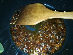 利用电磁炉和锅的余温,下老干妈,翻炒后开火,炒出红油爆出香味,保千万别炒过了,否则老干妈变黑发苦,红油变黑油了。