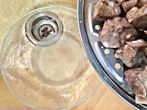 干锅烧热放入猪肺,会发现猪肺出水附带大量泡沫,熄火用水冲洗干净猪肺表面,洗锅