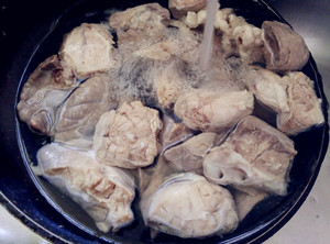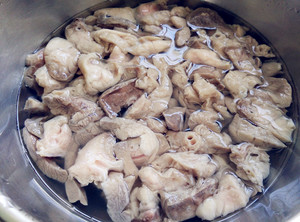 然后切几大块,放开水锅里煮会儿,用清水冲洗干净;