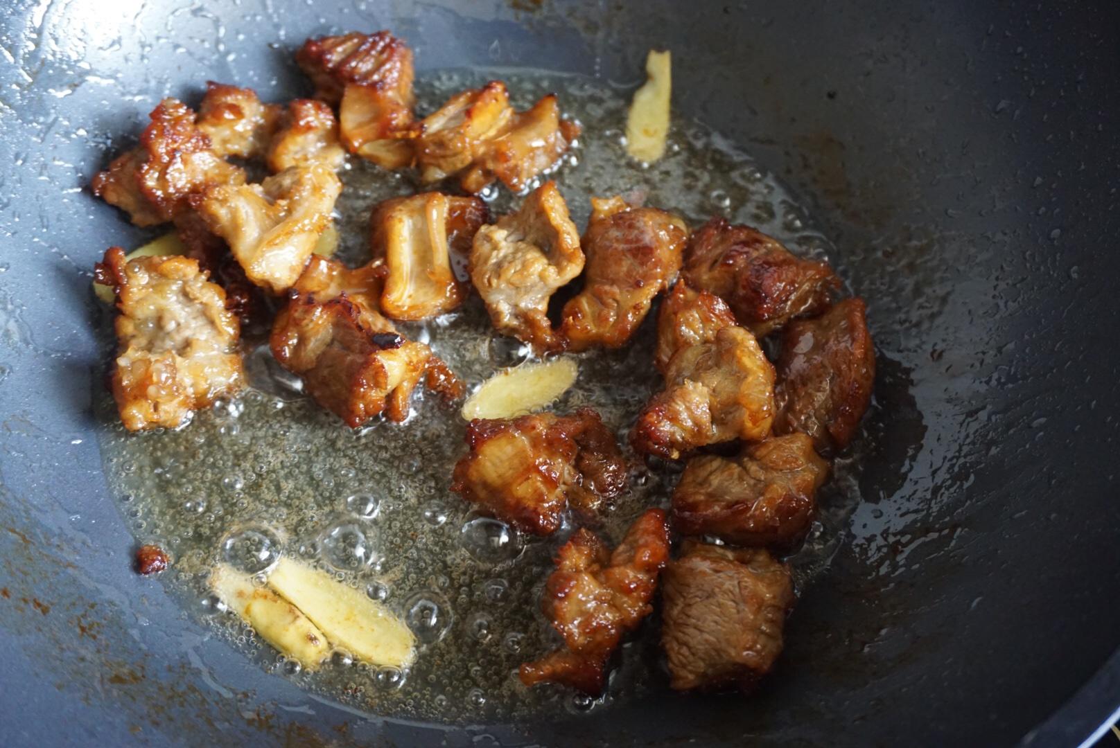 把生姜.桂皮.八角.那些材料放入牛腩翻炒出香味.