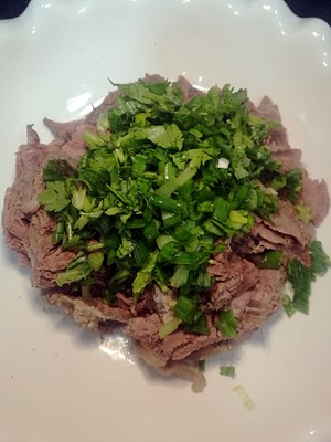 切好牛肉,放上小葱和香菜,准备凉拌了。