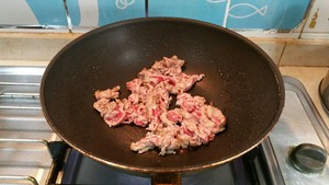 炒锅烧热,加入一汤匙的食用油。放入腌好的火锅牛肉片,用木筷子播散,炒制变色即可盛出。