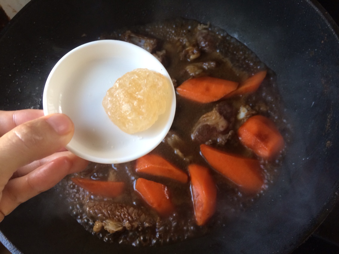 也可放白萝卜焖好把汤汁倒出放萝卜煮,煮到差不多把牛腩放回锅中煮上几分钟,切记放牛腩后不要煮太长时间,不然牛腩没有什么味道,用焖好的牛腩汁煮萝卜已经很好味道。