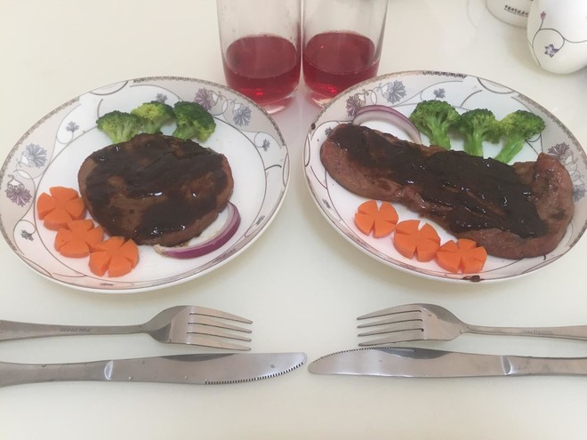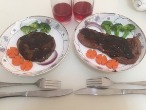 起锅后,把酱均匀铺在牛排上,按自己的喜好把西兰花,胡萝卜,洋葱条摆盘。成功!味道特别好??