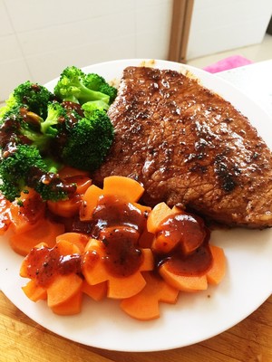 将焯好的胡萝卜和西兰花摆盘,黑椒汁加热十秒淋到牛排上,在撒一着黑胡椒,好呲的牛排就搞定啦.