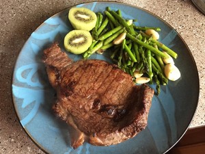 冷却间隙准备配菜:百搭的芦笋和用于餐后解腻的奇异果。若有红酒的话,最好不过了。