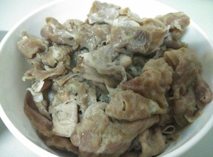 肥牛在热水里汆熟(也可以裹点淀粉,那样肉更嫩)捞碗里待用