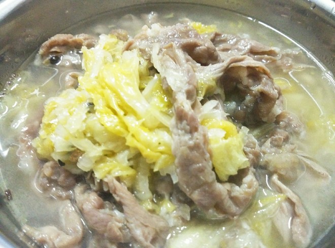 加热水,把炒过的酸菜煮开……(我的花椒没捞干净……能看到有炒黑的花椒)加点盐,也可以放点鸡精