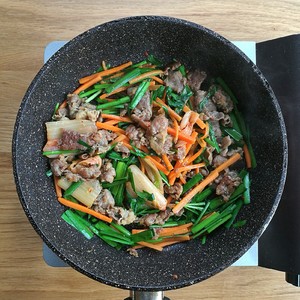 材料:熟糙米饭200g、肥牛片120g、泡菜40g、韭菜60g、胡萝卜90g