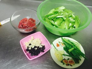 4、锅里剩下的油,依次放进剁碎的豆豉,姜片,蒜片爆香,苦瓜倒入翻炒一下,再将牛肉倒入,放蚝油,盐,糖,料酒炒匀,最后倒点水淀粉勾芡,撒上香葱段,拨拉一下装盘即可。