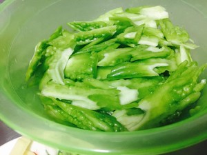 苦瓜切成两半,去瓤和籽,斜刀切片,放进一小勺盐腌十分钟左右,用水冲洗几遍。