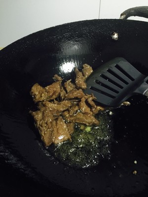 起油锅,多放点油,五分热时,将腌过的牛肉倒进锅里过下油,稍变色即可捞出来,待用。