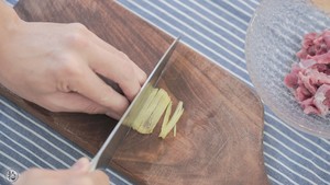 拌入肉片中,加入盐和淀粉,拌匀腌制15分钟。