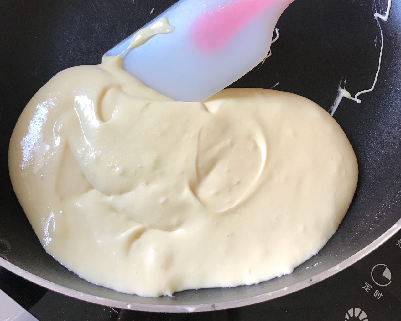 煤气开小火,不粘锅放入黄油,用刮刀轻轻搅拌,融化