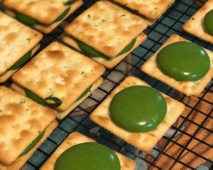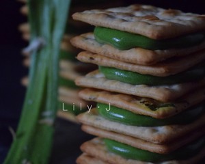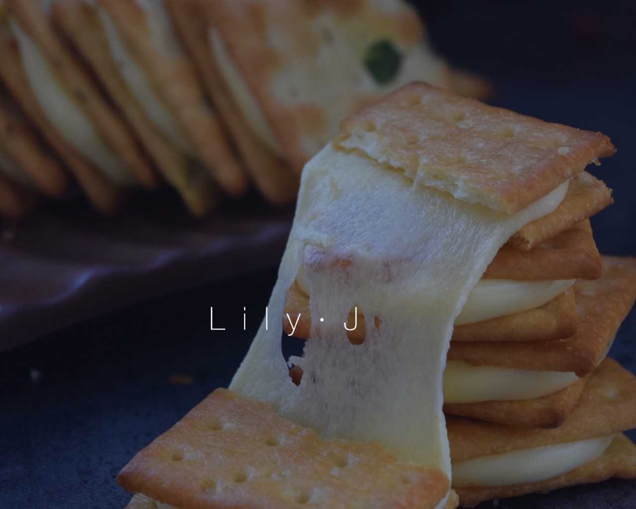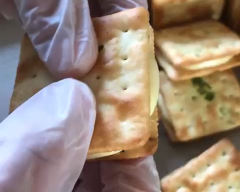 拿一块苏打饼干,我用的中祥葱香苏打饼干,用小勺子或者你觉得方便的工具,挑一点牛轧糖放饼干上,再另外拿一块饼干压上去,按一下,制作完成,是不是超级简单??