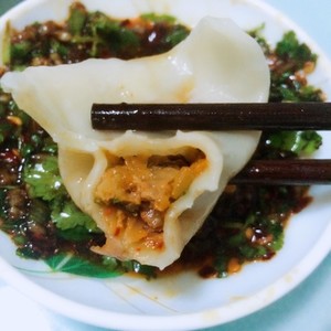 韩国泡菜、牛肉剁碎,生姜、小葱、香菜切末,锅里放食用油、花椒烧热后把花椒弄出来丢掉,把油和前面的菜放一起,再适量加盐、鸡精、酱油然后顺时针一个方向搅拌,饺子馅就好了。