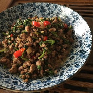 下小米辣翻炒,薄荷和小米辣可以一起下,但是如果要盛出不辣的,就这个顺序啦,另外,小米辣翻炒时间短一些,也不是那么辣了。北方同学吃起来正好,南方同学可以吃辣椒过瘾^_^