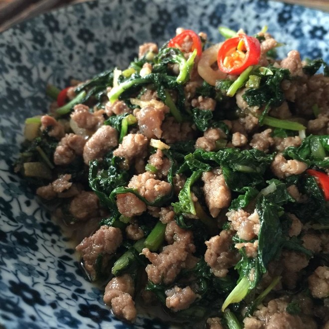 下牛肉沫翻炒,牛肉沫下锅前可以加入一点小粉抓匀,避免炒老。