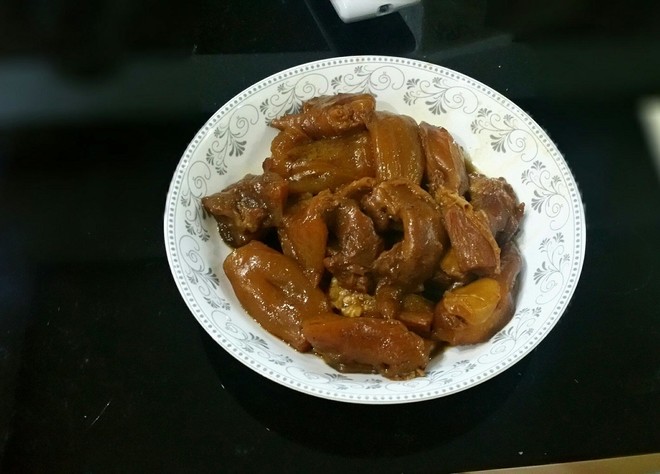 加入红酱油,五香粉,料酒,生姜,盐,加水炖煮,可以根据自己的喜好来决定炖煮时间的长短,我是晚上8点多放入小炖锅,设定凌晨2点开始炖煮,一直到早上7点,出炉热腾腾时是入口即化,冷却后变得Q弹爽口~