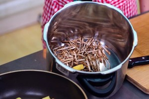 将牛蒡丝放入高压锅,再加入大块拍好的姜。