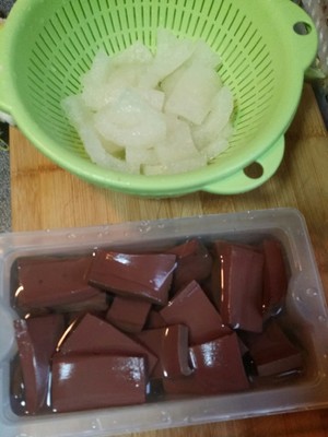 鸭血切块,浸泡在清水里待用,肉皮准备好,后来看食材蛮多的,就没有放。