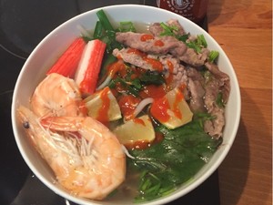 沸水中放入河粉烫熟,捞出。再分别放蔬菜和肉类烫熟,捞出。将食材分到碗里,挖一勺牛油和一大勺鱼露,浇入滚烫的高汤,撒点sriracha。