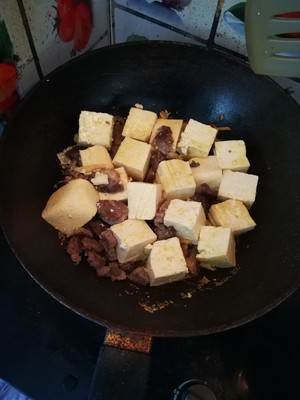 热锅放油爆香姜丝,放牛肉翻炒至变色放入豆腐继续翻炒几分钟(不易过多翻豆腐会碎的)豆腐有金黄即可