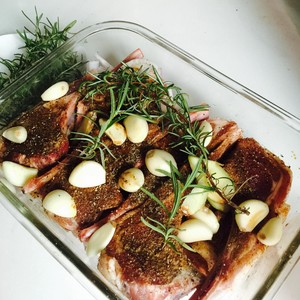 上面放上大蒜、姜片、和新鲜的罗勒叶。腌制2到3小时,进烤箱预热上下180度烤40分钟。