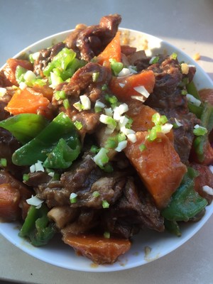 准备配菜,我是喜欢吃啥就往里面放啥。炖到羊腿能用筷子插透了,下胡萝卜,开盖炖,边炖边收汁了,再下土豆和洋葱大蒜,最后辣椒。