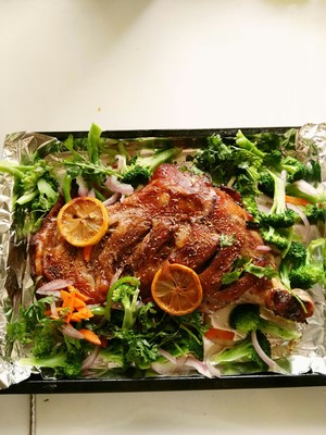 将羊腿划刀,一品鲜,耗油,盐,黑胡椒粉柠檬汁拌匀涂抹羊腿,撒上洋葱孜然腌制一晚以上。烤盘铺锡纸,将羊腿有筋膜的一面(就是图片上的正面)先朝下,倒入腌制剩下的酱汁及洋葱柠檬,180°烤40分钟。将烤盘拿出,捡出洋葱,将烤出来的汁水倒掉,羊腿翻面,刷少许植物油继续烤40分钟。西蓝花焯水。锅底少量植物油,将西蓝花,洋葱,青椒,(还可以放金针菇,杏鲍菇可以根据自己喜好)放入锅中翻炒片刻,加盐,黑胡椒粉,香菜。将羊腿拿出换一张干净锡纸,重新放回羊腿,正面朝上,撒上烧烤料,孜然粒。将炒好的菜铺在羊腿四周,入烤箱200°烤10分钟即可。