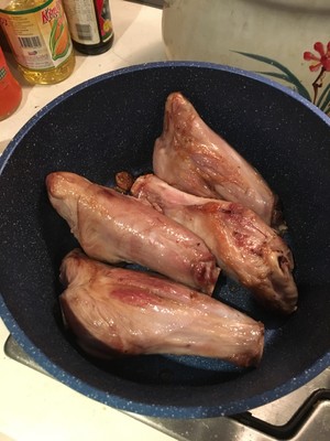 倒进红酒、番茄泥、水、黑胡椒和盐糖调味,煮两分钟让酒精挥发一下,放迷迭香,调小火盖上盖子煮至羊腿软烂,汤汁浓稠。