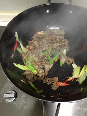 起油锅,下姜丝,然后下小米椒丝。煸炒一会下肥羊片炒。