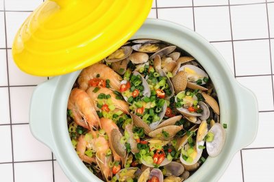 小純丫丫老师分享的花甲鲜虾粉丝煲的做法,怎么做简单又好吃?需要哪些食材?心食神小...
