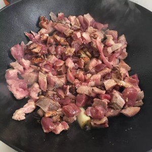 油烧热,所有调料放入炒香。驴肉切小块放入,翻炒均匀。