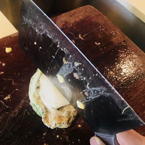 我买的是冷冻的青边鲍,提前一晚解冻,用刷刷干净,用刀背打几下,让它软一点,方便出味