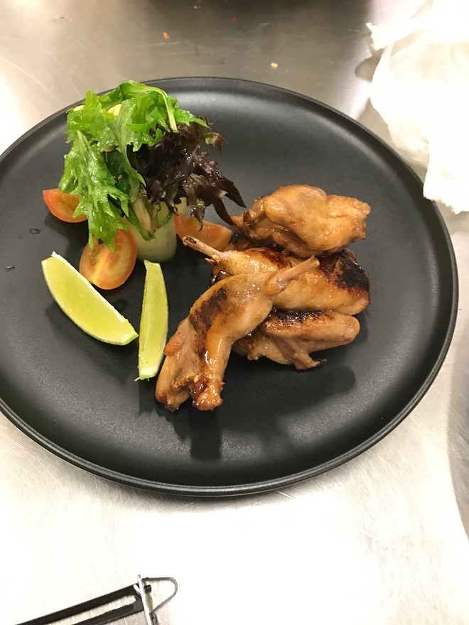 撒适量的盐和胡椒调味,将烤好的鹌鹑取出放置一分钟,让肉放松,这个时候可以做个沙拉做配菜,沙拉的酱料可以用醋:橄榄油 1:2。然后就可以摆盘了,吃之前可以浇一点柠檬汁,看个人喜好。