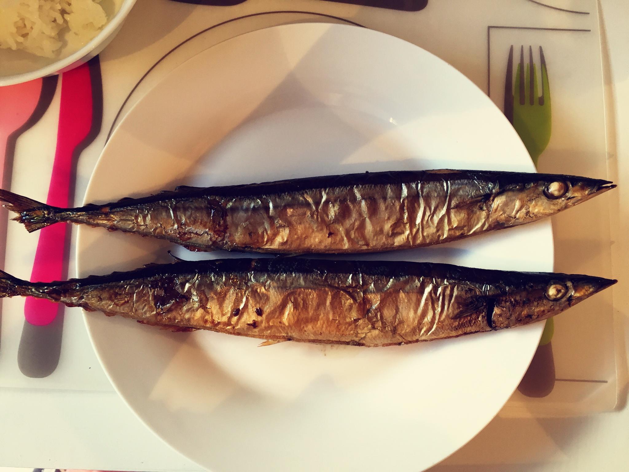 秋刀鱼入烤箱,烤7分钟后拿出翻面,再烤7分钟后取出。开吃!