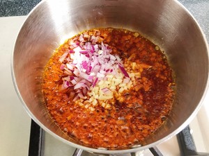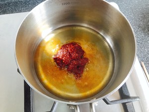 奶锅加热倒油,油温稍微升高放入剁好的豆瓣酱翻炒至香