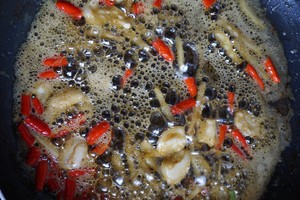 锅里底油..放小米椒.生姜大蒜下去爆香!