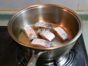带鱼先用细盐涂抹腌制15分钟,热锅热油,转小火煎制。煎至表面金黄色时翻面再煎至金黄色,盛出备用。