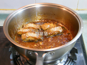锅内冷油,放入姜蓉,蒜蓉,葱碎爆香。倒入煎好的鱼块,注入清水,放入生抽,砂糖,老抽。大火煮开后,加盖小火焖煮。